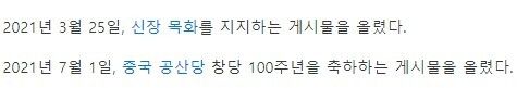 신장억압 지지, 공산당 창당 100주년 축하게시물 업로드등 행보를 이어가는중