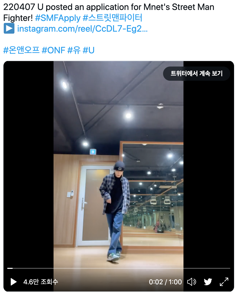 “220407 U posted an application for Mnet's Street Man Fighter! #SMFApply #스트릿맨파이터 ▶️ https://t.co/0owLXvFC5X #온앤오프 #ONF #유 #U https://t.co/FtTiTWD4lf”