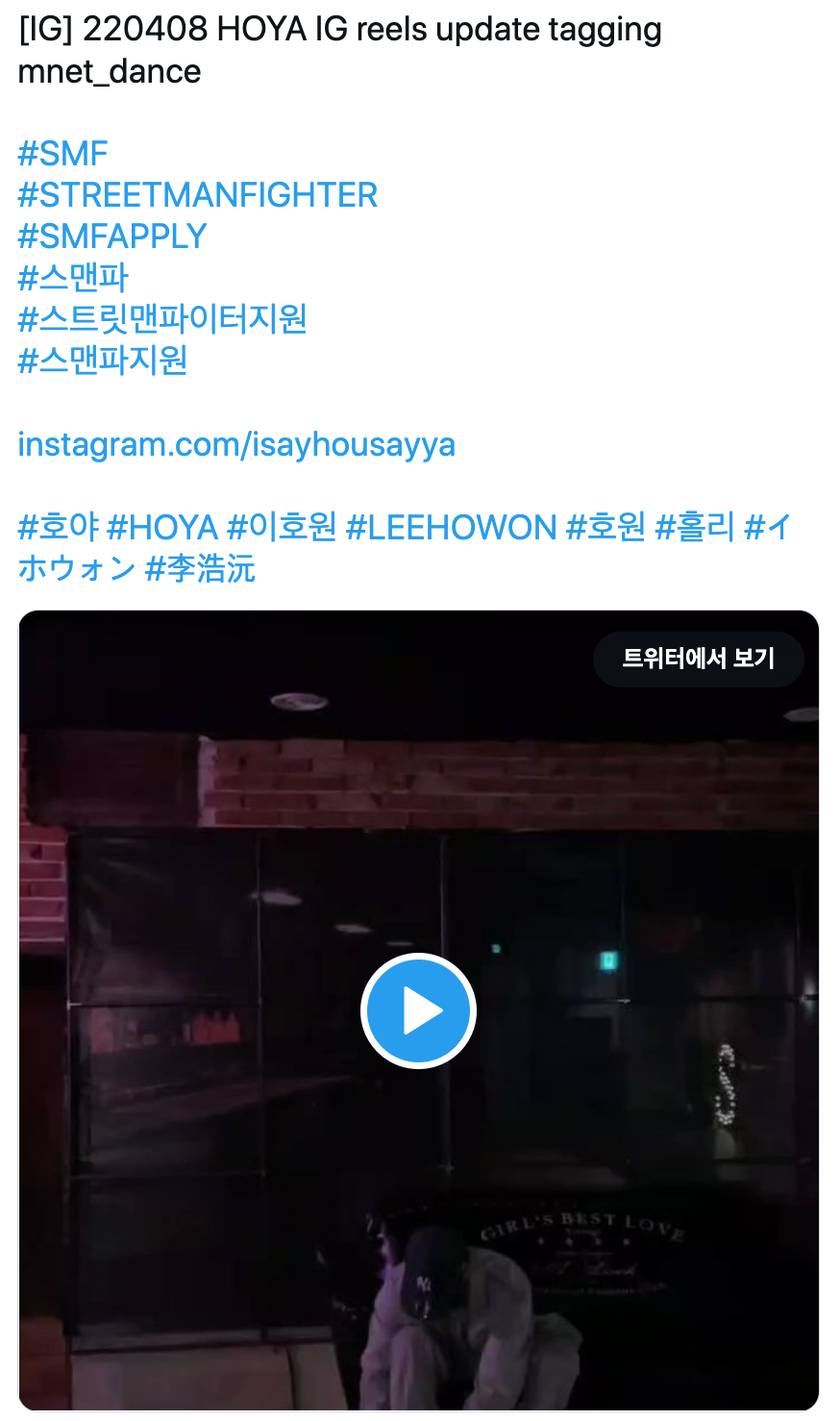 “[IG] 220408 HOYA IG reels update tagging mnet_dance #SMF #STREETMANFIGHTER #SMFAPPLY #스맨파 #스트릿맨파이터지원 #스맨파지원 https://t.co/bPSDIwX5BK #호야 #HOYA #이호원 #LEEHOWON #호원 #홀리 #イホウォン #李浩沅 https://