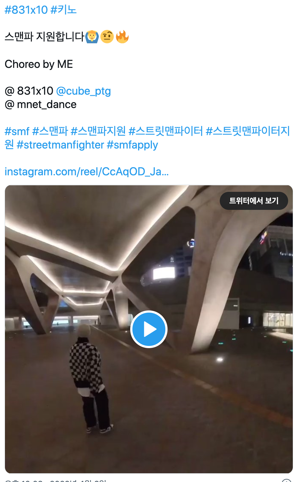 “#831x10 #키노 스맨파 지원합니다🙆♂️🤨🔥 Choreo by ME @ 831x10 @cube_ptg @ mnet_dance #smf #스맨파 #스맨파지원 #스트릿맨파이터 #스트릿맨파이터지원 #streetmanfighter #smfapply https://t.co/cUCQs5tPXa https://