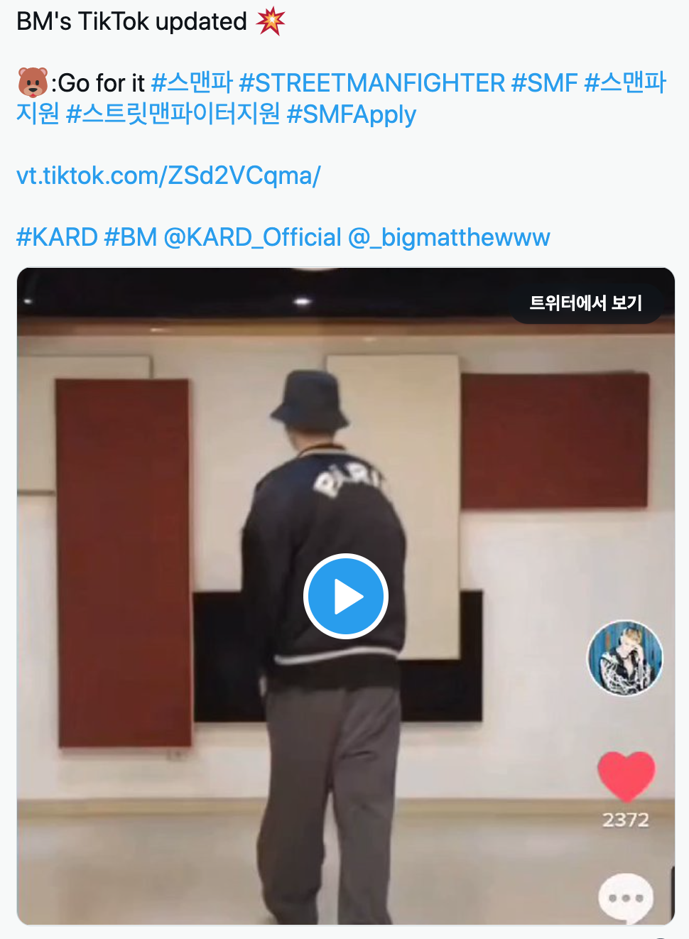 “BM's TikTok updated 💥 🐻:Go for it #스맨파 #STREETMANFIGHTER #SMF #스맨파지원 #스트릿맨파이터지원 #SMFApply https://t.co/v4LzeVqN96 #KARD #BM @KARD_Official @_bigmatthewww https://t.co/Hmv8E6AWDY”