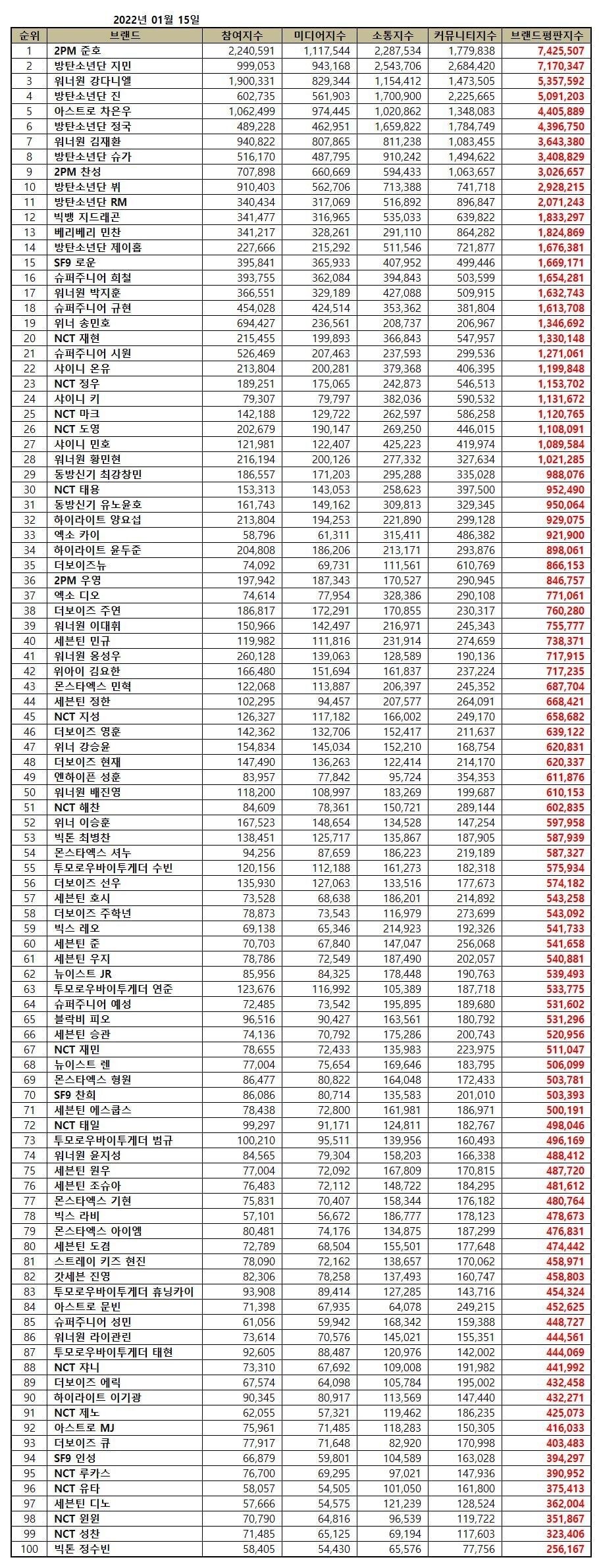 2022년 1월 보이그룹 개인 브랜드평판 100위 브랜드는 2PM 준호, 방탄소년단 지민, 워너원 강다니엘, 방탄소년단 진, 아스트로 차은우, 방탄소년단 정국, 워너원 김재환, 방탄소년단 슈가, 2PM 찬성, 방탄소년단 뷔, 방탄소년단 RM, 빅뱅 지드래곤, 베리베리 민찬, 방탄소년단 제이홉, SF9 로운, 슈퍼주니어 희철, 워너원 박지훈, 슈퍼주니어 규현, 위너 송민호, NCT 재현, 슈퍼주니어 시원, 샤이니 온유, NCT 정우, 샤이니 키, NCT 마크, NCT 도영, 샤이니 민호, 워너원 황민현, 동방신기 최강창민, NCT 태용, 동방신기 유노윤호, 하이라이트 양요섭, 엑소 카이, 하이라이트 윤두준, 더보이즈뉴, 2PM 우영, 엑소 디오, 더보이즈 주연, 워너원 이대휘, 세븐틴 민규, 워너원 옹성우, 위아이 김요한, 몬스타엑스 민혁, 세븐틴 정한, NCT 지성, 더보이즈 영훈, 위너 강승윤, 더보이즈 현재, 엔하이픈 성훈, 워너원 배진영, NCT 해찬, 위너 이승훈, 빅톤 최병찬, 몬스타엑스 셔누, 투모로우바이투게더 수빈, 더보이즈 선우, 세븐틴 호시, 더보이즈 주학년, 빅스 레오, 세븐틴 준, 세븐틴 우지, 뉴이스트 JR, 투모로우바이투게더 연준, 슈퍼주니어 예성, 블락비 피오, 세븐틴 승관, NCT 재민, 뉴이스트 렌, 몬스타엑스 형원, SF9 찬희, 세븐틴 에스쿱스, NCT 태일, 투모로우바이투게더 범규, 워너원 윤지성, 세븐틴 원우, 세븐틴 조슈아, 몬스타엑스 기현, 빅스 라비, 몬스타엑스 아이엠, 세븐틴 도겸, 스트레이 키즈 현진, 갓세븐 진영, 투모로우바이투게더 휴닝카이, 아스트로 문빈, 슈퍼주니어 성민, 워너원 라이관린, 투모로우바이투게더 태현, NCT 쟈니, 더보이즈 에릭, 하이라이트 이기광, NCT 제노, 아스트로 MJ, 더보이즈 큐, SF9 인성, NCT 루카스, NCT 유타, 세븐틴 디노, NCT 윈윈, NCT 성찬, 빅톤 정수빈 이다.