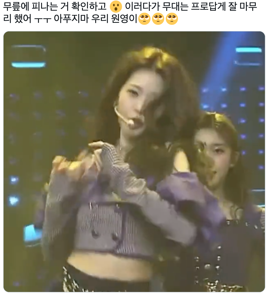 “무릎에 피나는 거 확인하고 😮 이러다가 무대는 프로답게 잘 마무리 했어 ㅜㅜ 아푸지마 우리 원영이🥺🥺🥺 https://t.co/rC6FdvogAb”