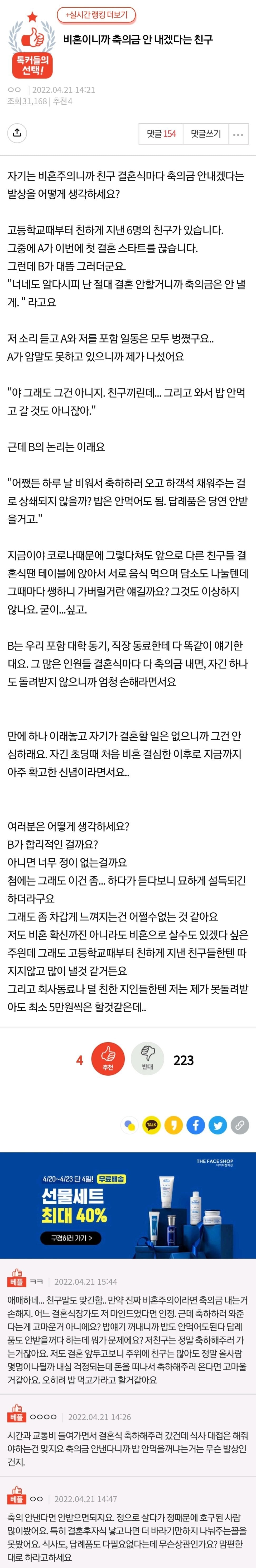 해당 발언에 모두가 당황했고, 아무 말 못하는 B를 본 A씨가 나섰다고 한다. A씨는 축의금을 내지 않겠다는 친구 C에게 "야 그래도 그건 아니지, 친구끼린데…와서 밥 안 먹고 갈 것도 아니잖아"라고 말했다는 것.