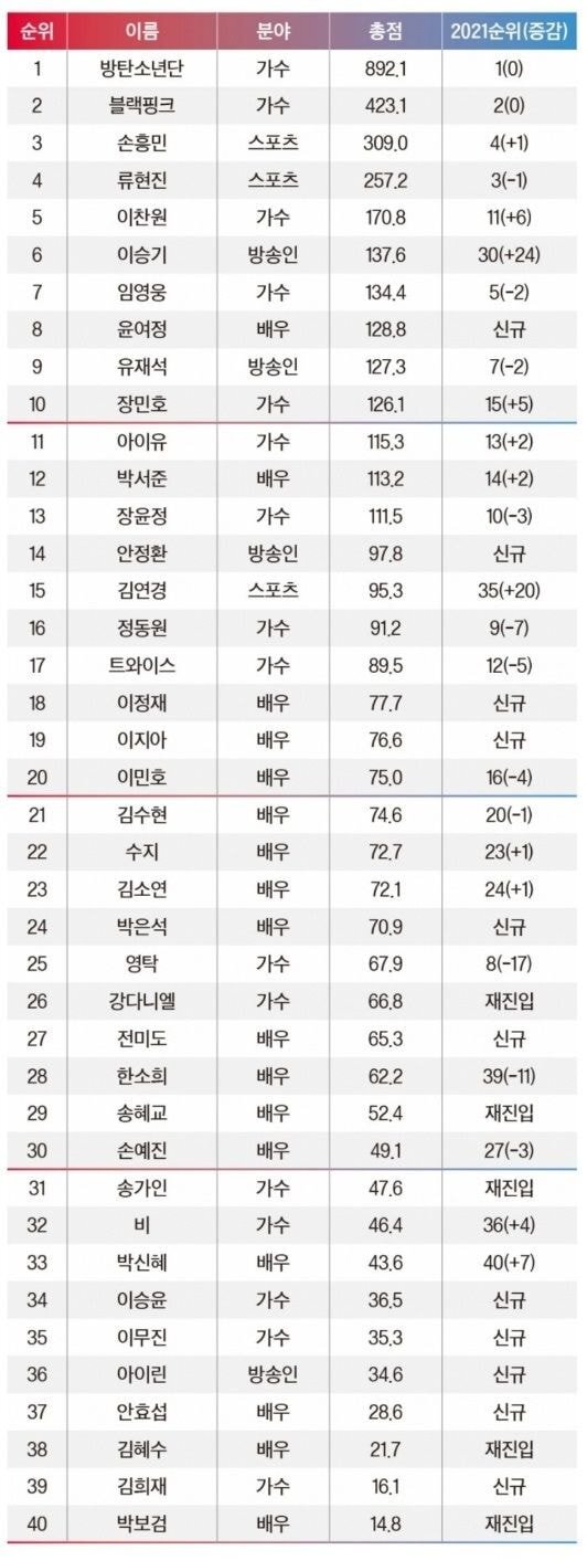 2022 포브스코리아 선정 파워 셀러브리티 40