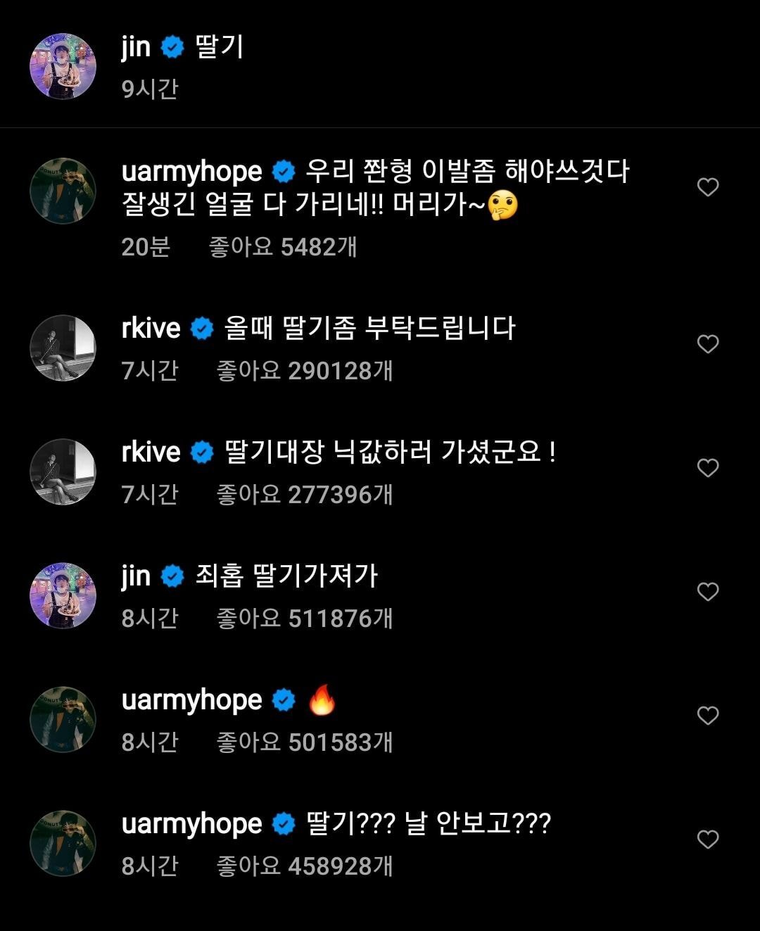 삼촌네 딸기 농장에 다녀온 후 올린 진 인스타에 달린 제이홉 댓글부터 시작됨ㅋㅋㅋ