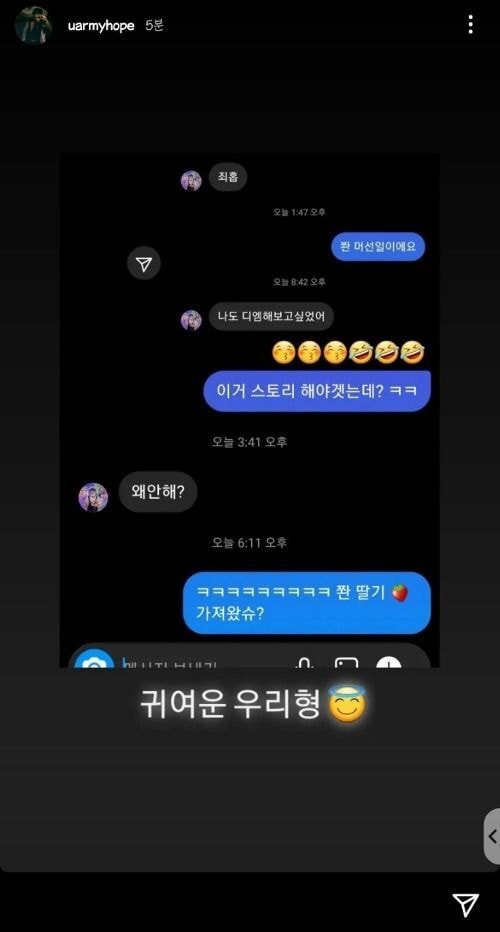인스타 디엠 기능이 써 보고 싶어서 같은 팀 멤버 제이홉에게 보냄ㅋㅋㅋ