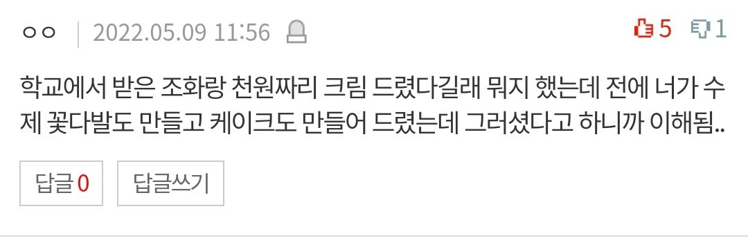 그냥 학교에서 받은 조화 꽃 한 송이 (물론 샀다고 구라는 쳤지만..)랑 20ml짜리 나이트 크림(천원짜리) 드렸거든 편지는 미루고 미루다가 어제밤에 쓸려고 했는데 빨리 자라고 엄청 화내셔서 그