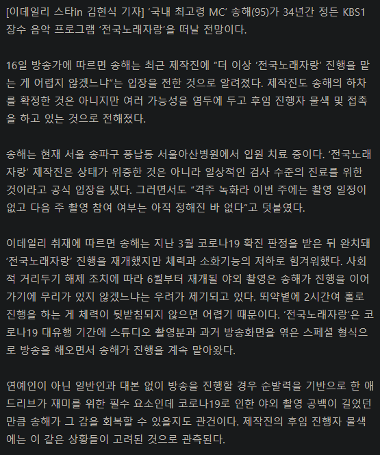 국내 최고령 MC 송해가 건강문제로 34년간 정든 KBS1 장수 음악 프로그램 ‘전국노래자랑’을 떠날 것으로 보인다.