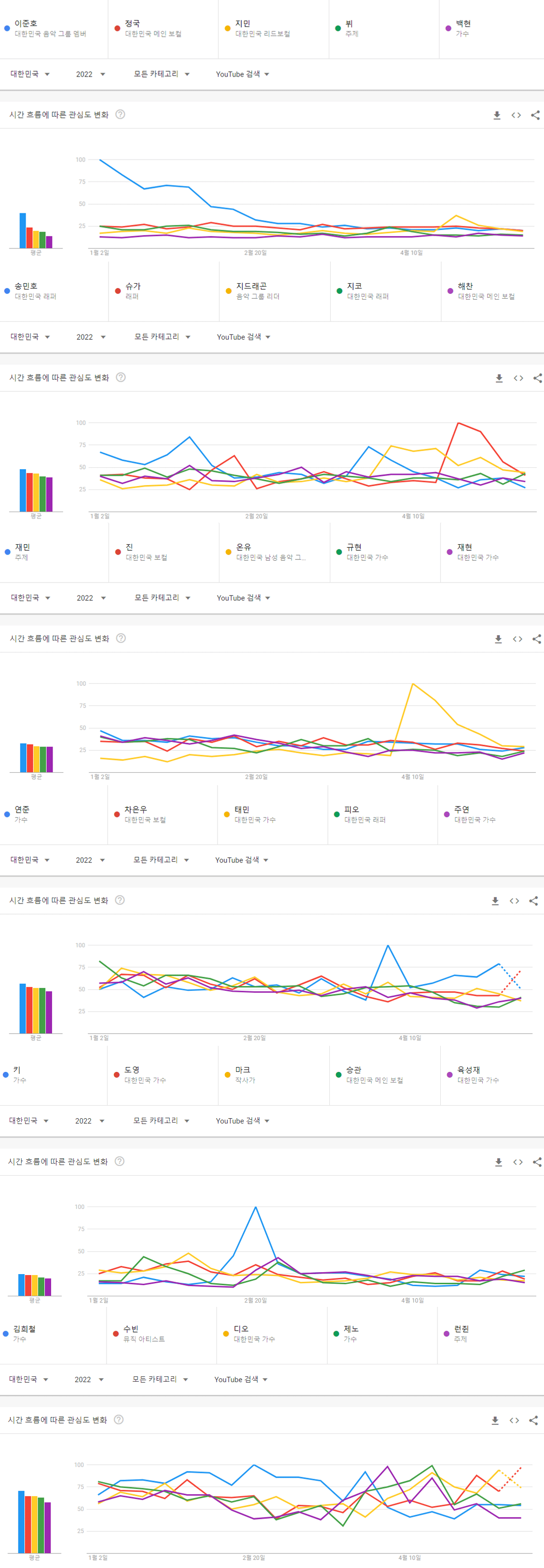 2022년 현재까지 국내 유튜브에서 가장 많이 검색된 남자아이돌그룹 멤버 TOP30