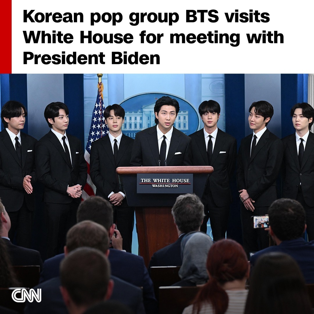 “Thanks for having us at the White House! It was a huge honor to discuss important issues with @POTUS today. We're very grateful for #BTSARMY who made it all possible.🫰💜 #BTS #방탄소년단 #BTSatTheWhiteHouse”