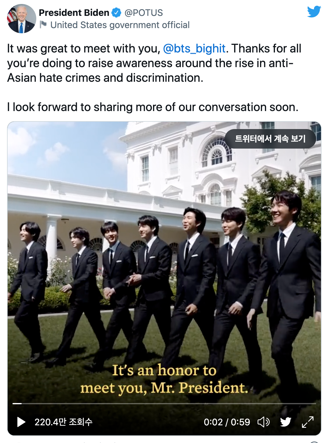 바이든 대통령은 트위터에 “비티에스를 만나서 반가웠다. 당신들이 아시아계에 대한 혐오 범죄 증가와 차별에 대한 관심을 불러일으키기 위해 한 일에 감사한다”는 글을 올렸다.