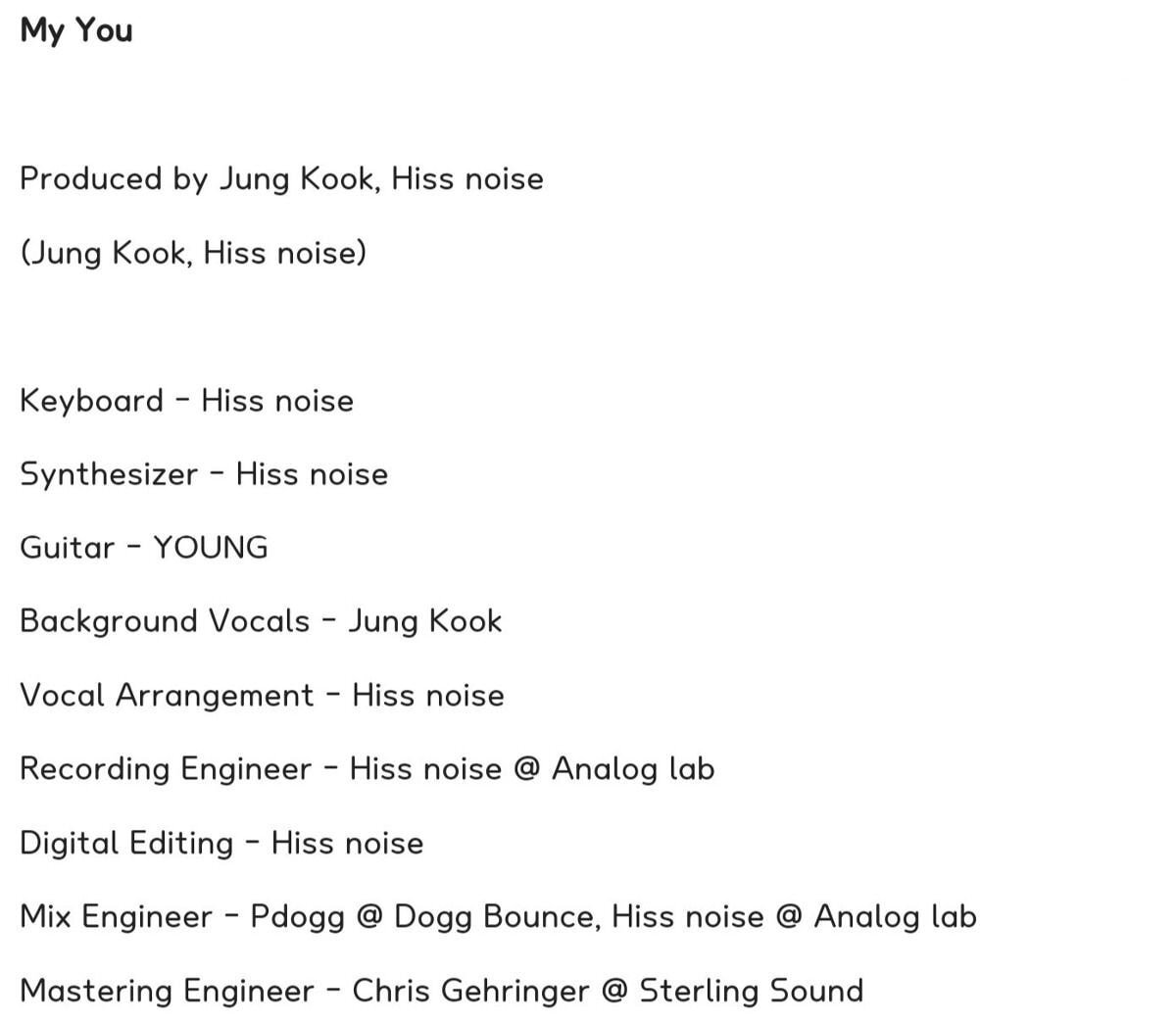 My You Produced by Jung Kook, Hiss noise (Jung Kook, Hiss noise) Keyboard - Hiss noise Synthesizer - Hiss noise Guitar - YOUNG Background Vocals - Jung Kook Vocal Arrangement - Hiss noise Recording E