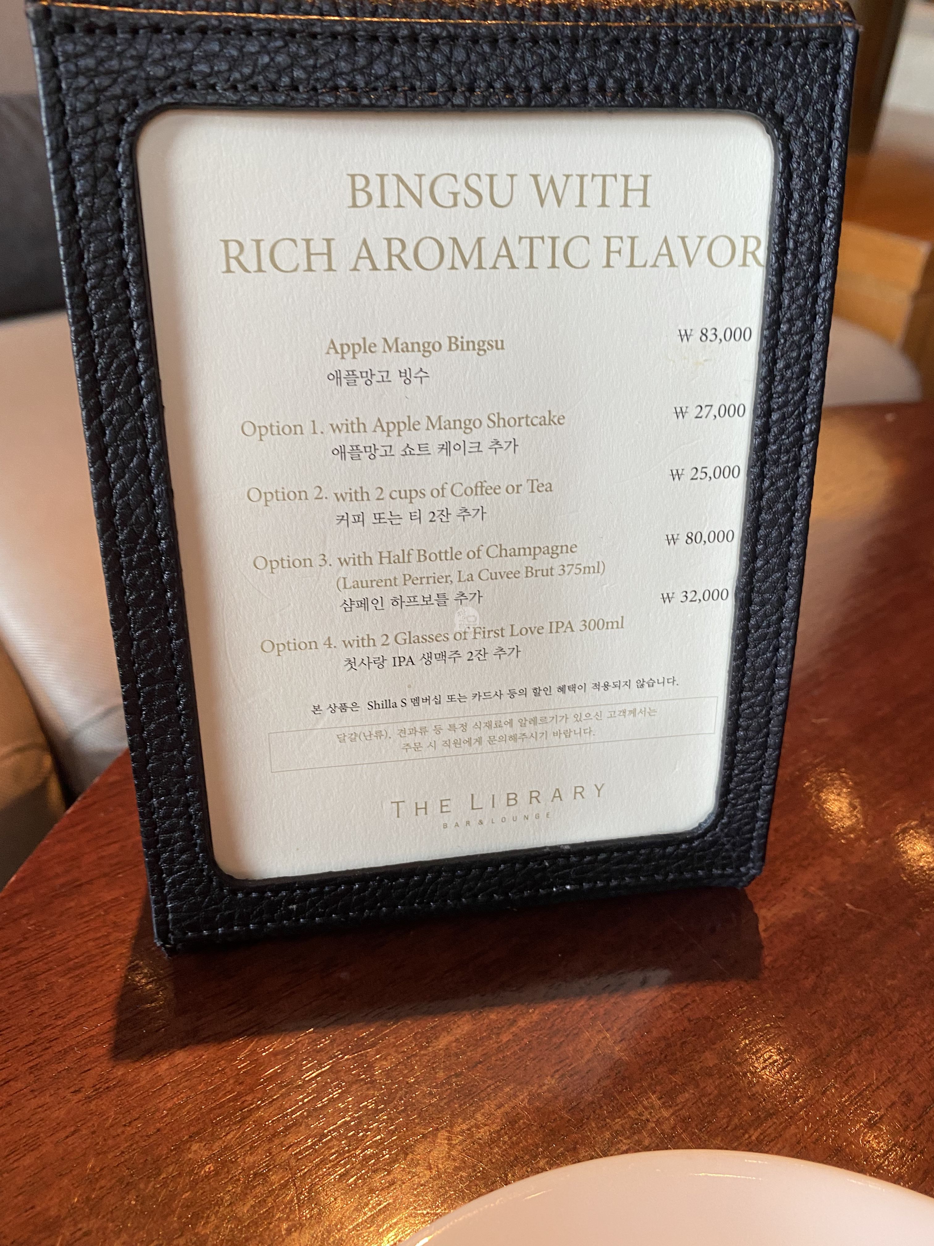 신라 호텔 서울 내 더 라이브러리에서 먹은 올 해의 기간 한정 빙수인 애플 망고 빙수입니다