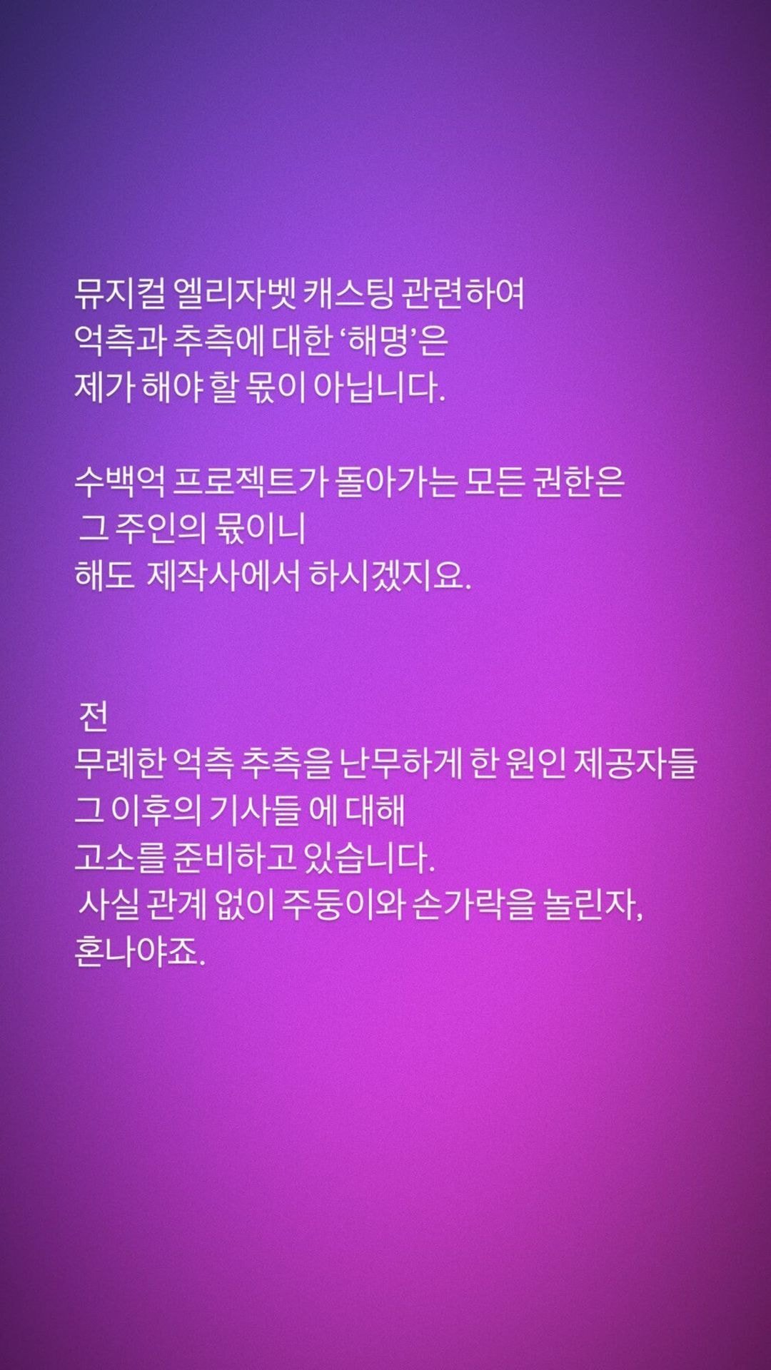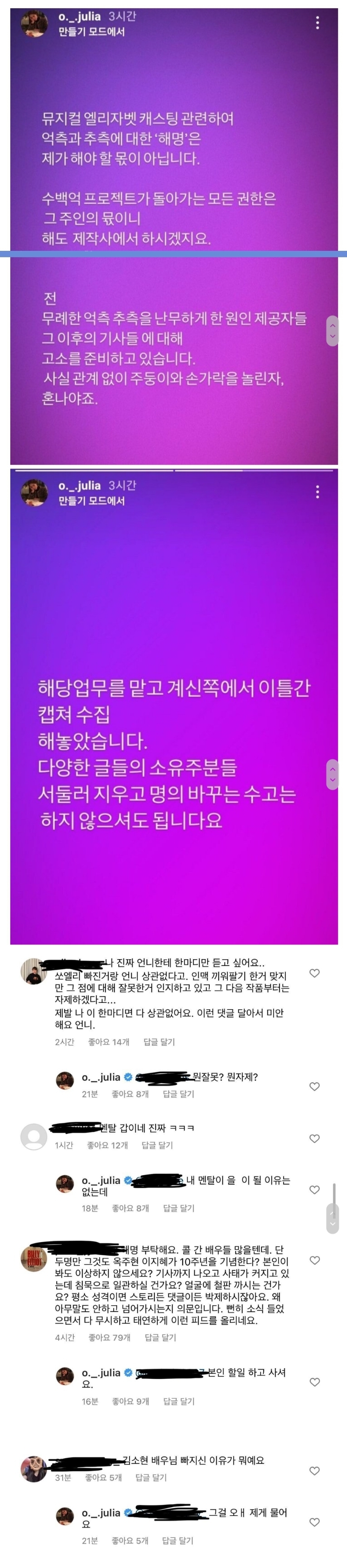 엘리자벳 관련 옥주현 인스타 댓글 상황