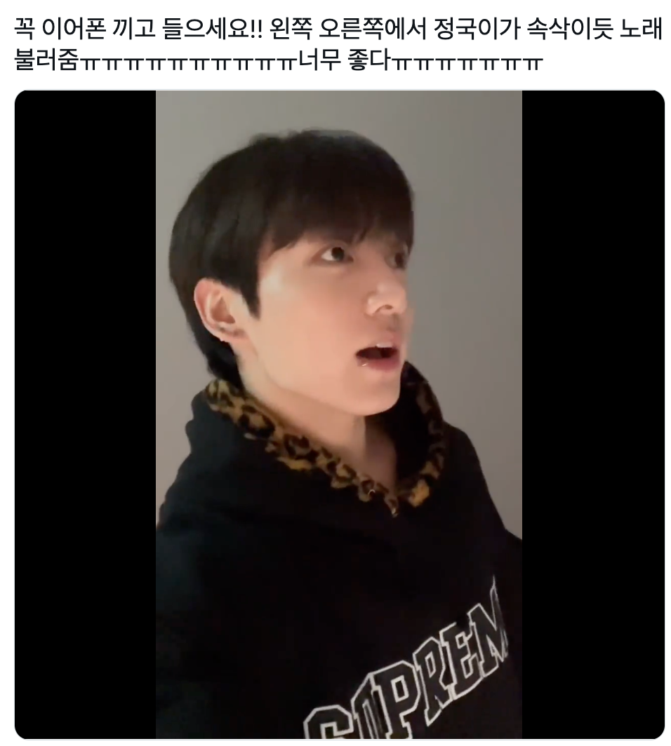 “꼭 이어폰 끼고 들으세요!! 왼쪽 오른쪽에서 정국이가 속삭이듯 노래 불러줌ㅠㅠㅠㅠㅠㅠㅠㅠㅠㅠ너무 좋다ㅠㅠㅠㅠㅠㅠㅠ”