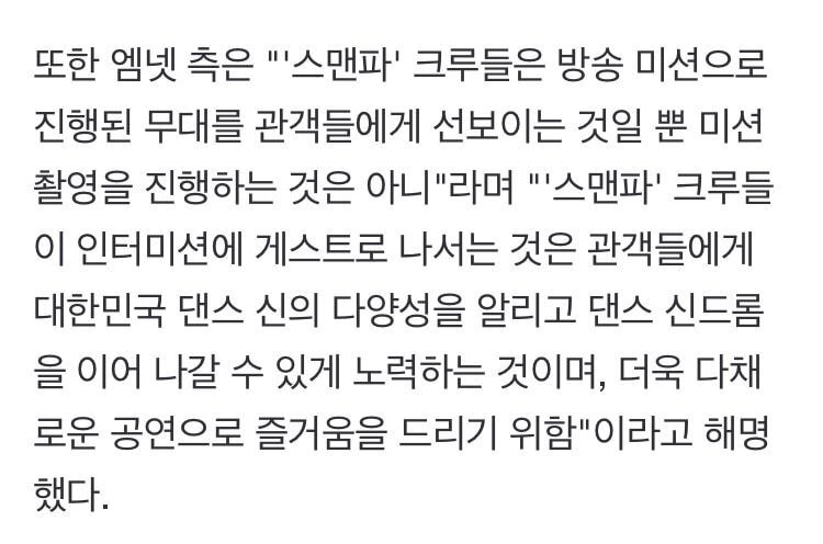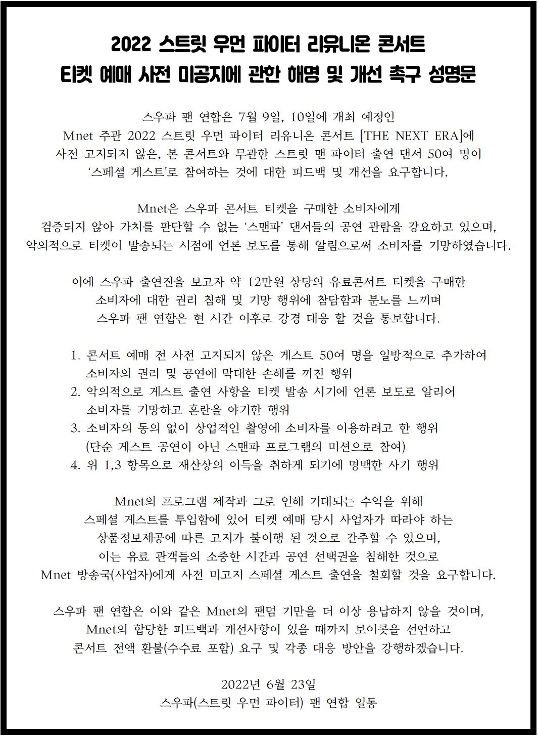스우파 콘서트에 스맨파 게스트 올리는거 관련 입장문 낸 엠넷
