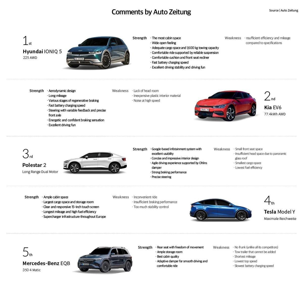 2022 아우토 자이퉁(Auto Zeitung) 전기차 비교평가 종합 1위