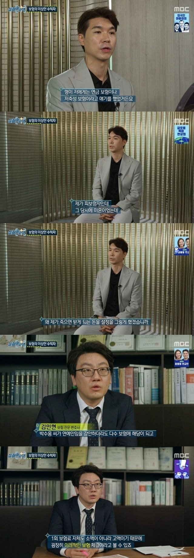 보험 2개는 친형이 소유한 법인회사에서 가입됐고 박수홍은 “내 목숨이 담보돼 있는데 이걸 제가 보험 법상으로 아무것도 하지 못하는 상황이라는 게 정말 비참했다”고 토로했다. 2개 보험은 회사가 해지를 하지 않으면 박수홍이 소송을 통해 해지해야 하는 상황이었다. (사진=MBC ‘실화탐사대’ 캡처)