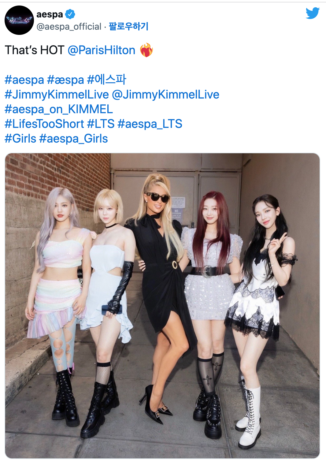 “That’s HOT @ParisHilton ❤️🔥 #aespa #æspa #에스파 #JimmyKimmelLive @JimmyKimmelLive #aespa_on_KIMMEL #LifesTooShort #LTS #aespa_LTS #Girls #aespa_Girls”