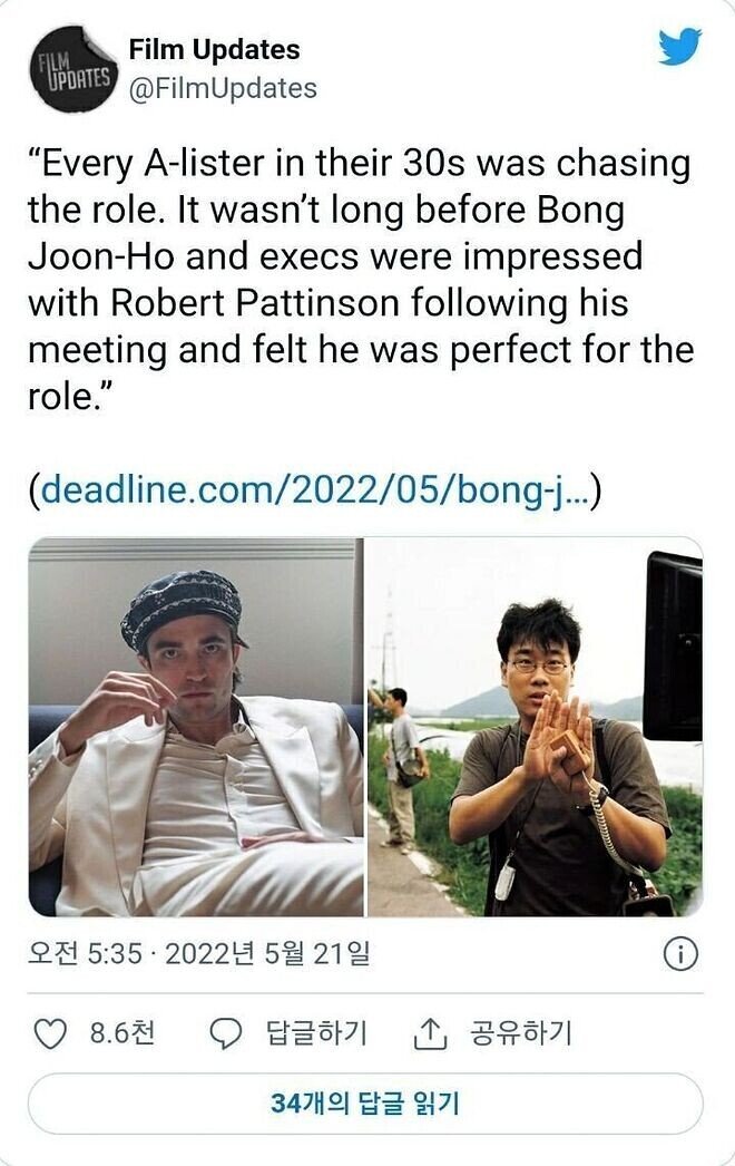 봉준호는 로버트 패틴슨과 미팅 후 바로 패틴슨으로 확정