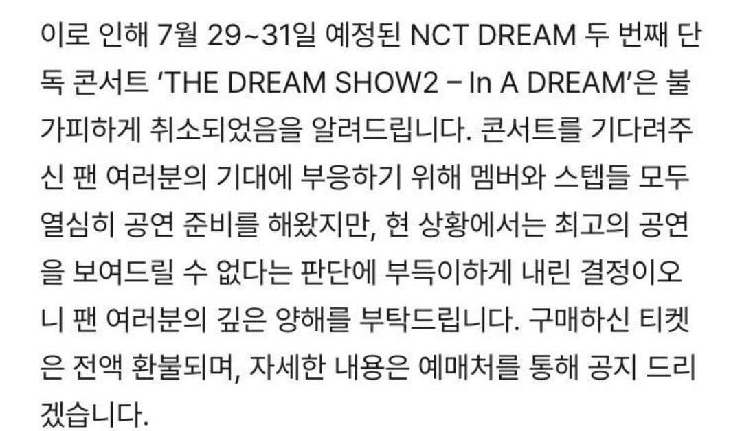이번주 예정이었던 엔시티드림 콘서트 오늘자 취소 공지....