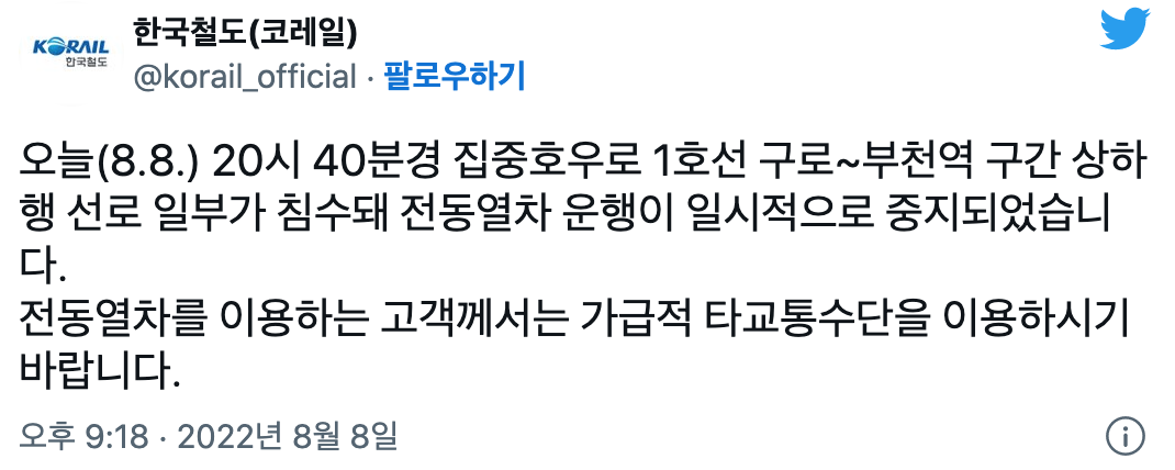 오늘(8.8.) 20시 40분경 집중호우로 1호선 구로~부천역 구간 상하행 선로 일부가 침수돼 전동열차 운행이 일시적으로 중지되었습니다. 전동열차를 이용하는 고객께서는 가급적 타교통수단을 이용하시기 바랍니다.