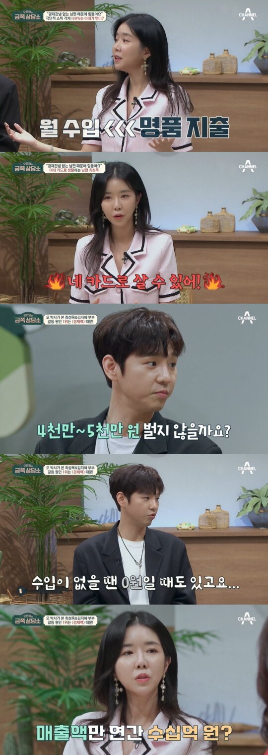 수입 차이도 컸다. 김지혜와 최성욱의 수입 차이는 99:1. 김지혜는 "(남편이) 아예 못 벌 때는 제가 100%는 번다. (남편이) 아무리 많이 벌어도 9:1"이라고 밝혔다. 최성욱은 "욕심을 내려놓고 작은 집, 작은 차를 타도 우리가 행복하면 되지 않나 싶다"고 했지만 김지혜는 "거짓말이라 생각한다. 명품남으로 욕을 많이 먹었다"고 짚었다.