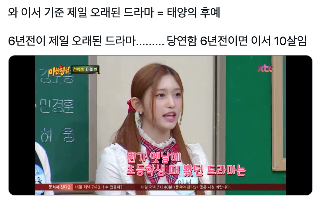 “와 이서 기준 제일 오래된 드라마 = 태양의 후예 6년전이 제일 오래된 드라마......... 당연함 6년전이면 이서 10살임”