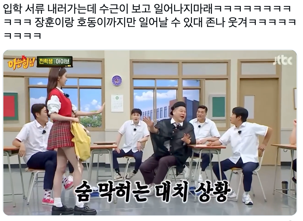 “입학 서류 내러가는데 수근이 보고 일어나지마래ㅋㅋㅋㅋㅋㅋㅋㅋㅋㅋㅋ 장훈이랑 호동이까지만 일어날 수 있대 존나 웃겨ㅋㅋㅋㅋㅋㅋㅋㅋㅋ”
