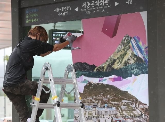 30일 오후 최근 재개장한 서울 광화문광장 버스정류장에서 서울시 관계자들이 조선총독부 등이 포함된 대형 포스터를 제거하고 있다.
