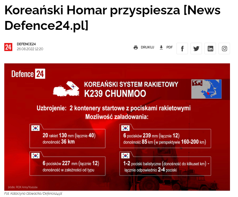 폴란드가 K2 전차, K9 자주포에 이어 또다른 한국산 ‘명품 무기' 도입을 저울질하고 있다. 정부 고위당국자가 이번에 언급한 무기는 K-239 천무 다연장로켓이다. 6개월 넘게 지속된 러시아의 우크