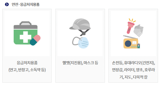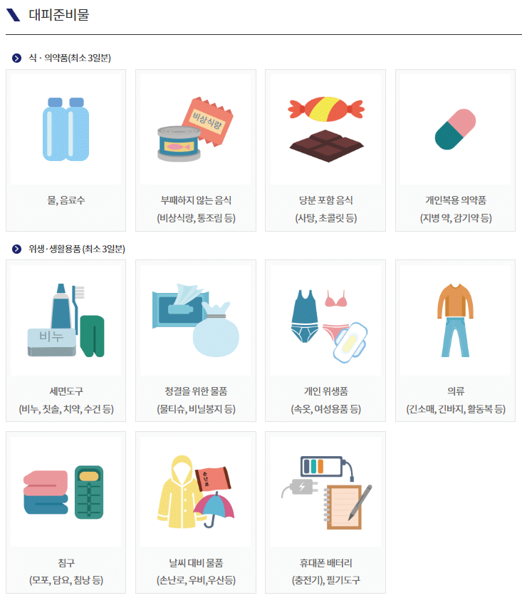준비물- 비상식량, 음료수, 손전등, 건전지, 성냥, 라이터, 휴대용라디오, 비상의류, 속옷, 병따개, 화장지, 수건, 구급용품, 귀중품(현금/보험증서), 안경 등(생활용품), 생리용품, 종이기저귀