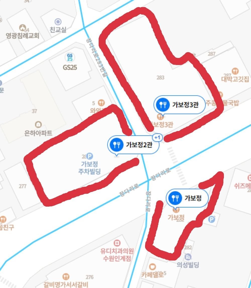 저렇게 사거리 한쪽 건물 1층에서 영업을 하던 가보정은 그 유명세로 인해 점점 커지게 됨