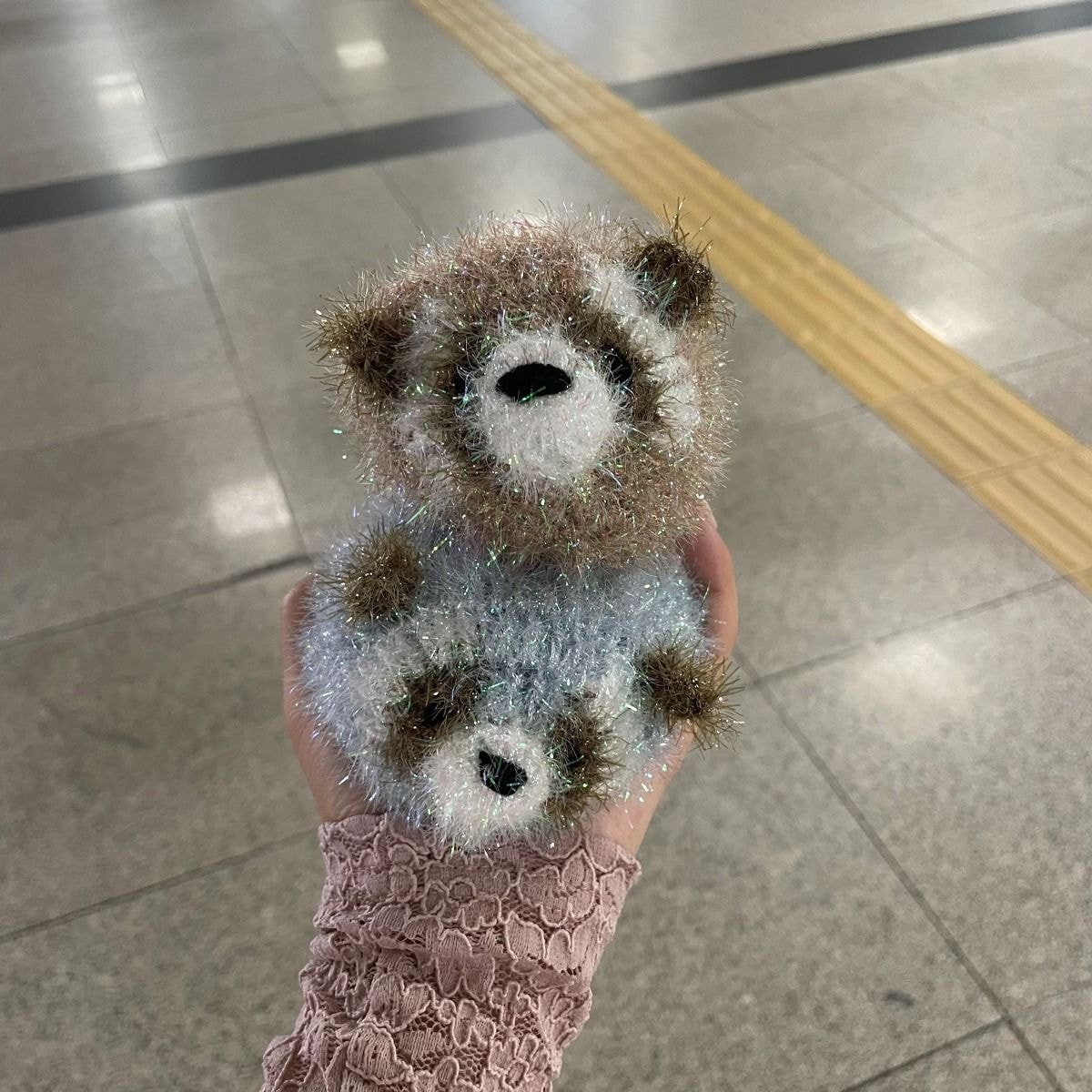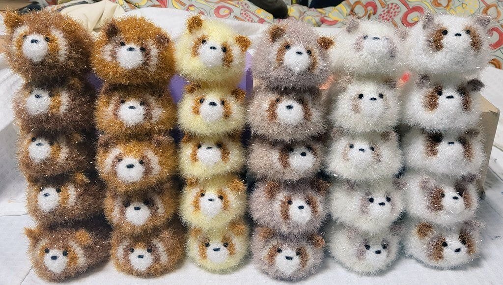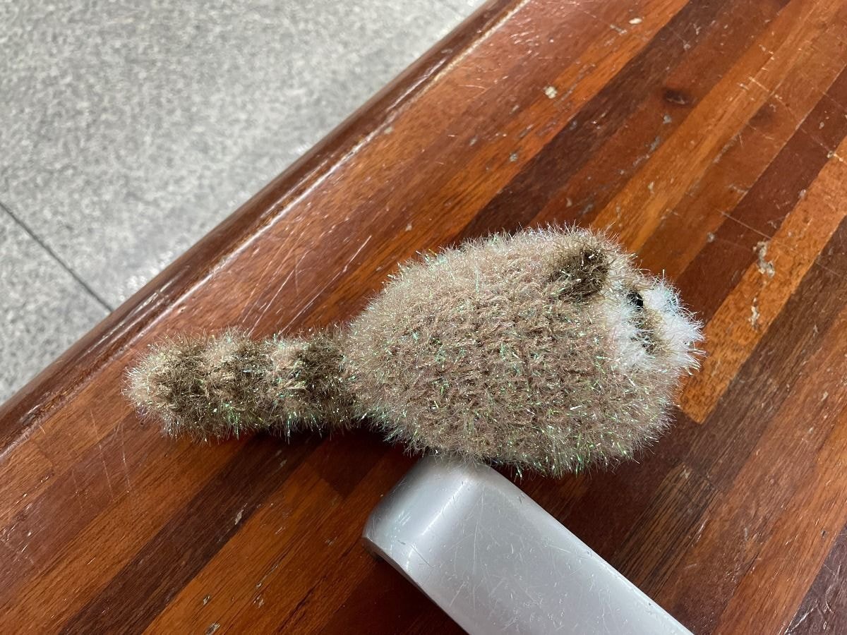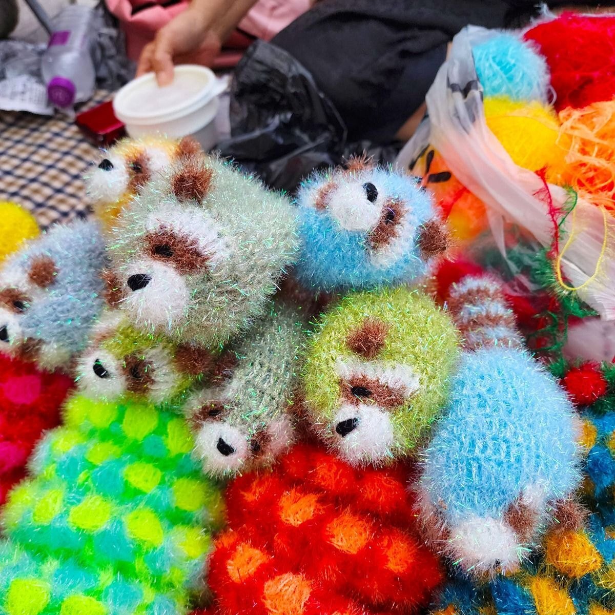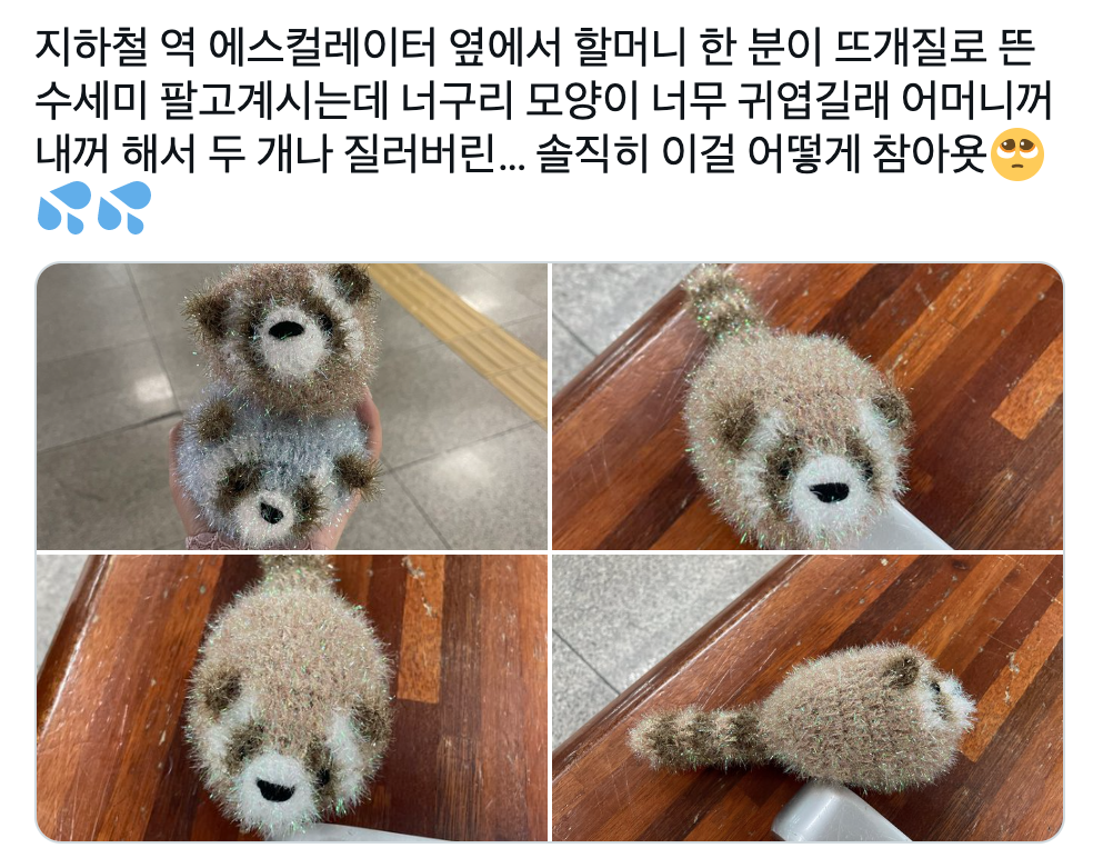 “지하철 역 에스컬레이터 옆에서 할머니 한 분이 뜨개질로 뜬 수세미 팔고계시는데 너구리 모양이 너무 귀엽길래 어머니꺼 내꺼 해서 두 개나 질러버린… 솔직히 이걸 어떻게 참아욧🥺💦💦