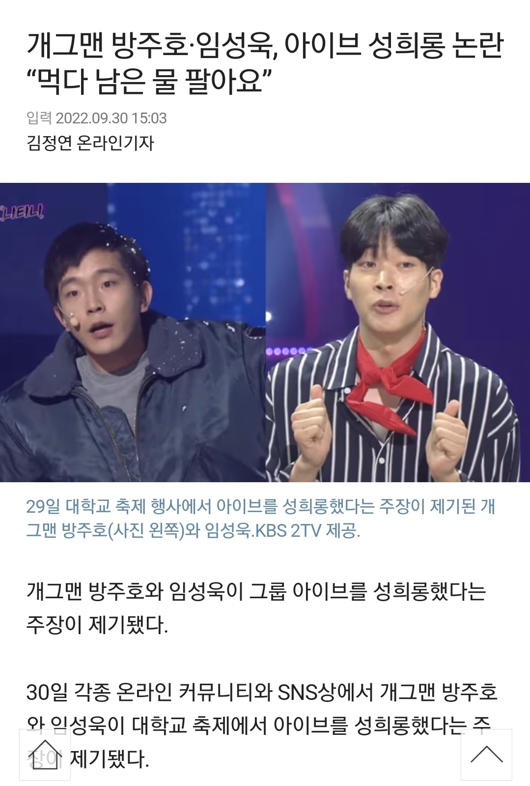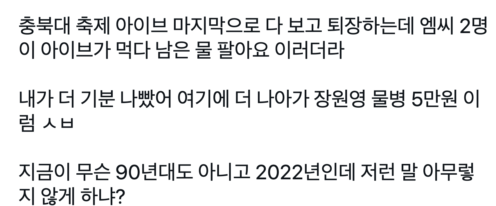 아이브가 퇴장하는데, MC였던 두 사람이 ‘아이브가 먹다 남은 물 팔아요’, ‘장원영 물병 5만 원’이라는 말을 했다”고 설명했다.