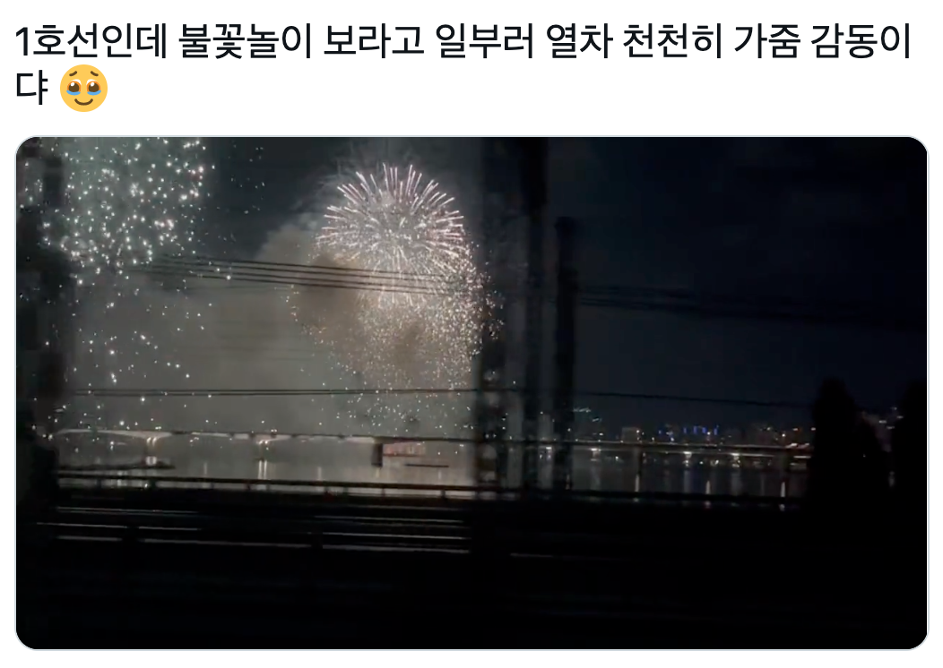 “1호선인데 불꽃놀이 보라고 일부러 열차 천천히 가줌 감동이댜 🥹”
