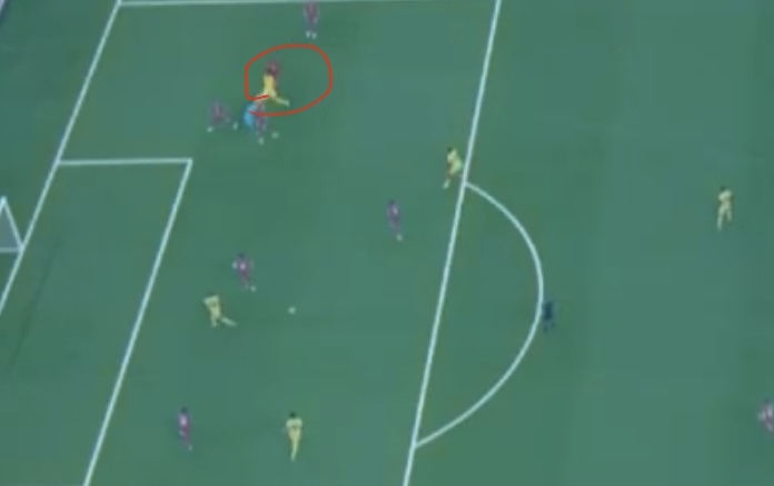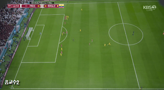 바로 이 장면인데, 근데 헤딩으로 넘겨주는 순간 키퍼가 빨간 원으로 표시된 카타르 수비수보다 앞으로 나가게 되고, 최종 수비수 전 선수는 빨간 원으로 표시한 카타르 수비수가 됨.
