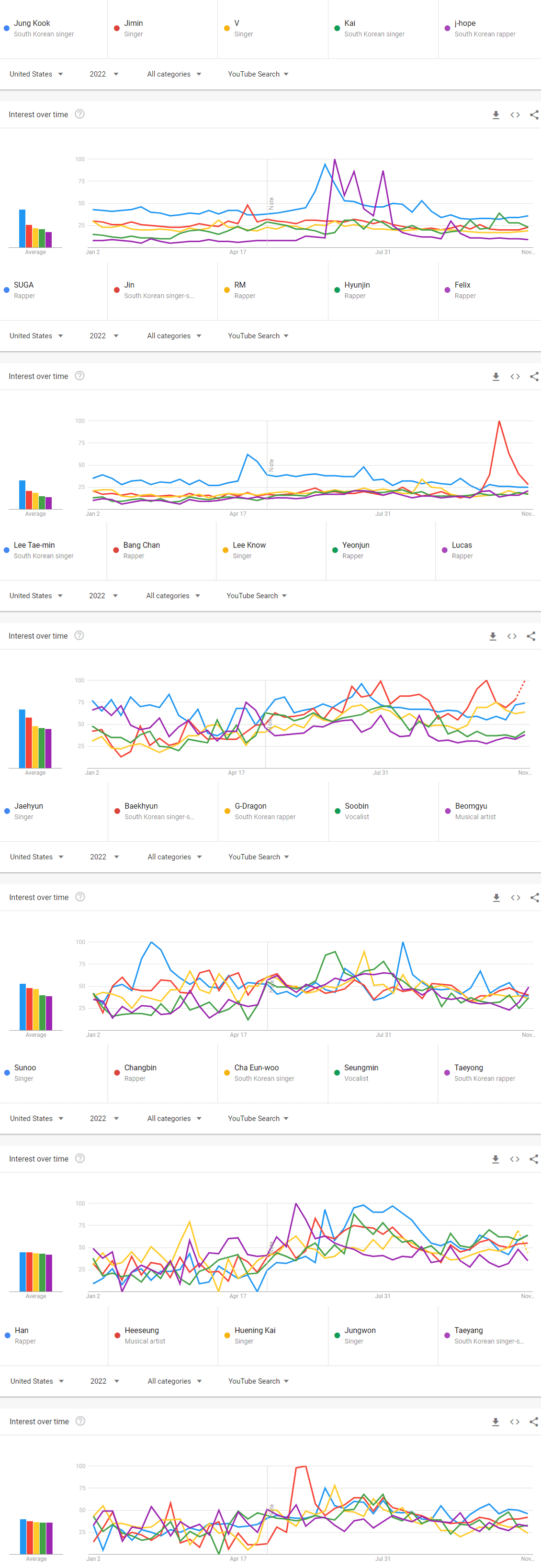 2022년 현재까지 미국 유튜브에서 가장 많이 검색된 케이팝 남자아이돌 멤버 순위