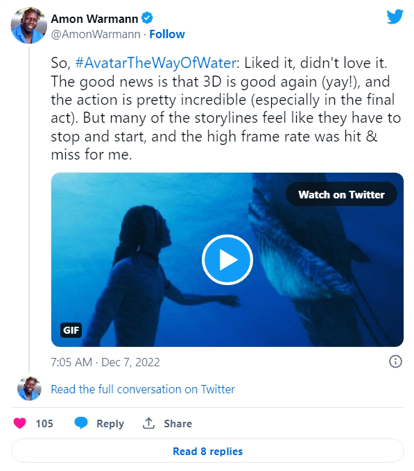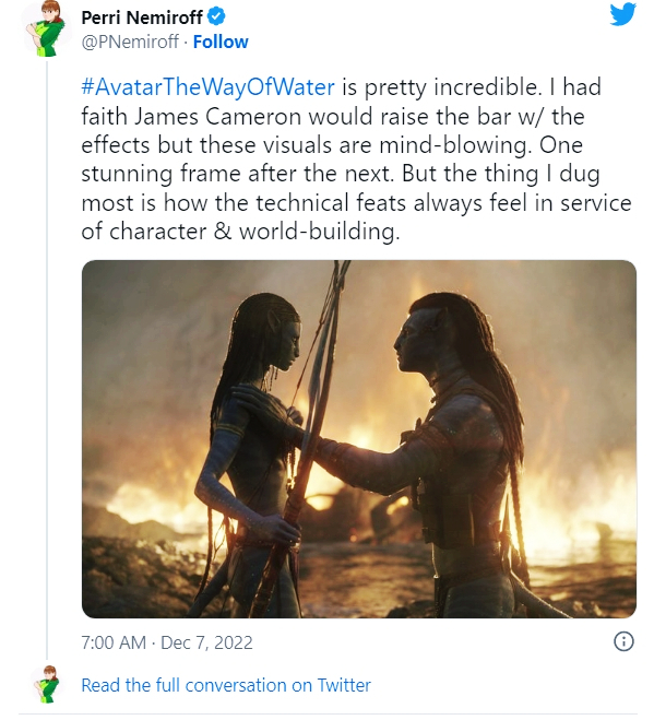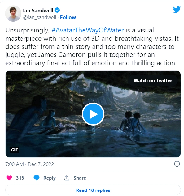 진정한 영화적 마술이다. <물의 길>은 획기적인 기술적 위업으로 가득찬 시각적 경이로움이 캐릭터와 세계관 구축에 완전히 기여하고 있다. 4.5/5