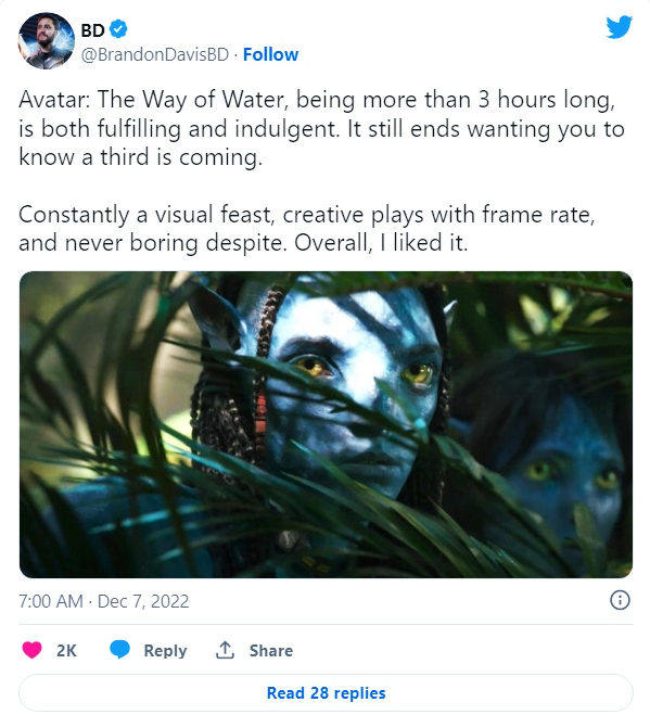 카메론이 세계관 구축을 하다 기진맥진했다면, 돈을 긁어모으기 위한 뻔한 속편들과는 차원이 다른 굉장한 진실성을 가졌을 것이다. 허나 게으른 카메론은 그러지 못했다.