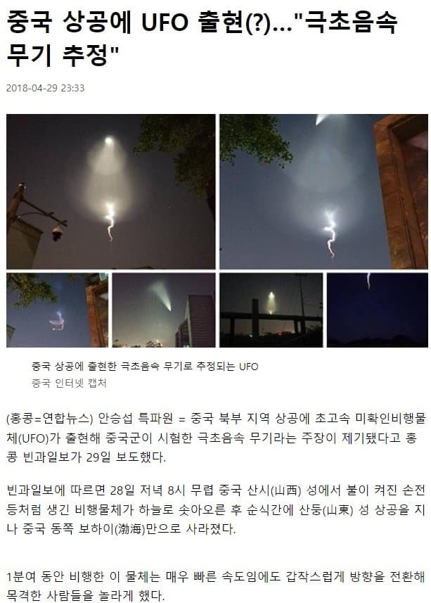 고고도 초음속미사일의 수증기응결 현상으로 추정된다고 함