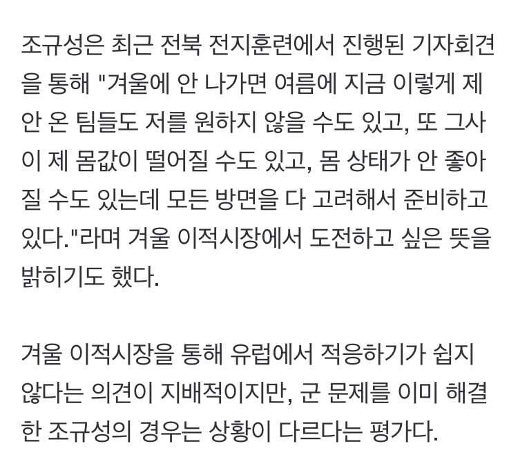 겨울 이적시장을 통해 유럽에서 적응하기가 쉽지 않다는 의견이 지배적이지만, 군 문제를 이미 해결한 조규성의 경우는 상황이 다르다는 평가다.