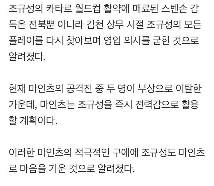 2022카타르월드컵 조별리그 가나전에서 2골을 터트려 스타로 떠오른 조규성은 최근까지 유럽행을 적극적으로 타진했다. 전북에 마인츠05(독일)와 셀틱FC(스코틀랜드), 미네소타 유나이티드(미국)가 ‘공식 제안’을 보냈고, 이 중 조규성은 마인츠와 깊이 연결됐다.