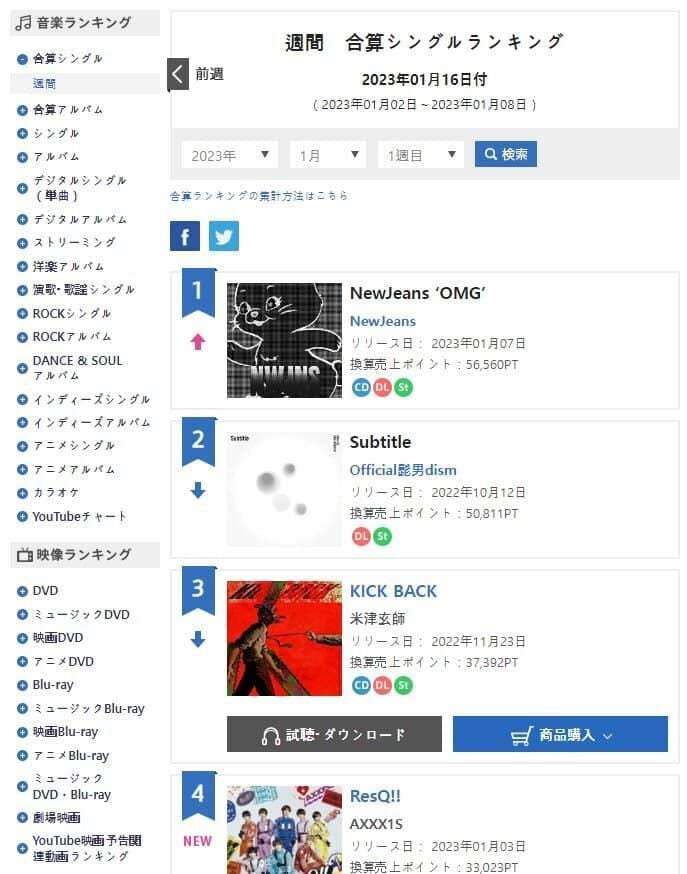 오리콘 합산싱글(CD+스트리밍) 차트 주간1위