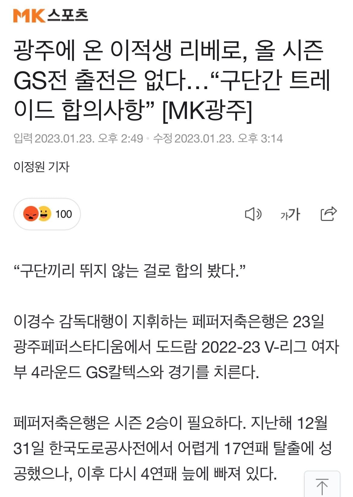 신생팀 페퍼저축은행과 트레이드 기사가 뜸