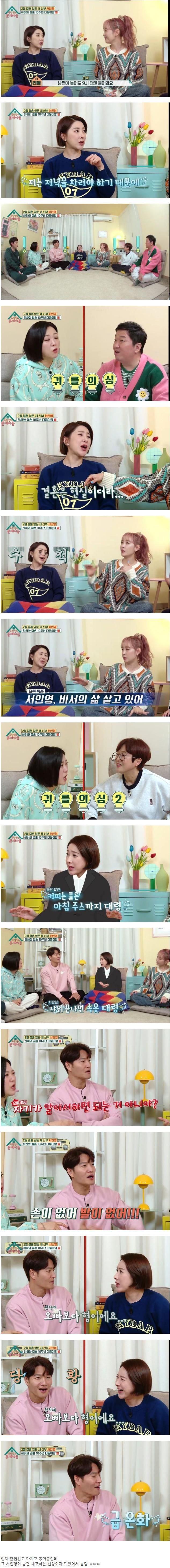 송은이가 "언제 결혼했냐"고 깜짝 놀라자 서인영은 "이제 간다. 혼인 신고를 먼저 했고 현재 같이 살고 있다"고 설명했다.