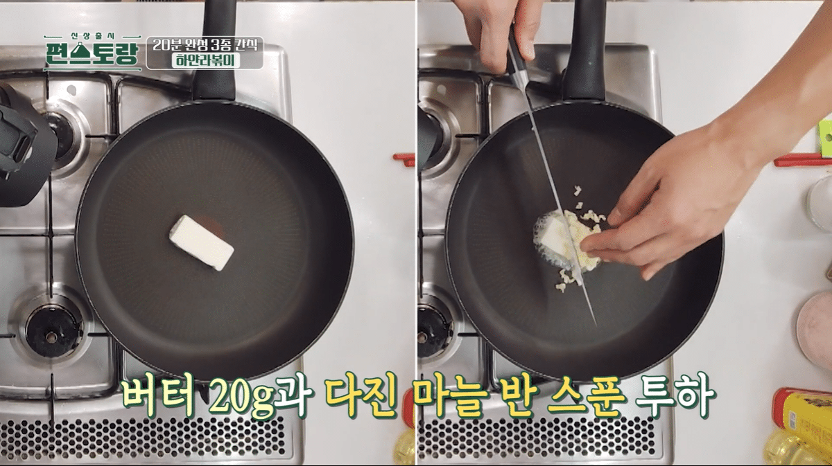 다진 마늘 0.5T에 버터 크래미 1조각만큼 넣고 볶다가