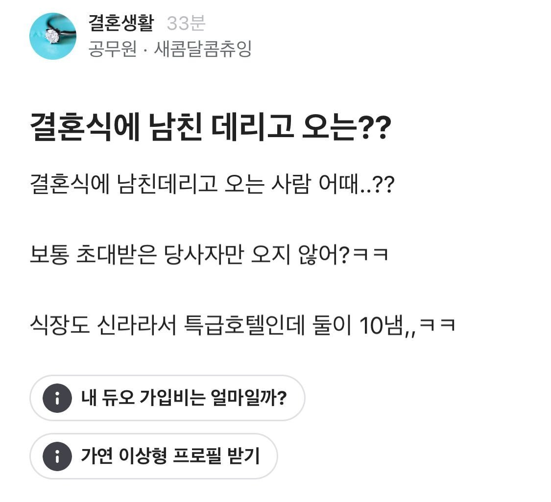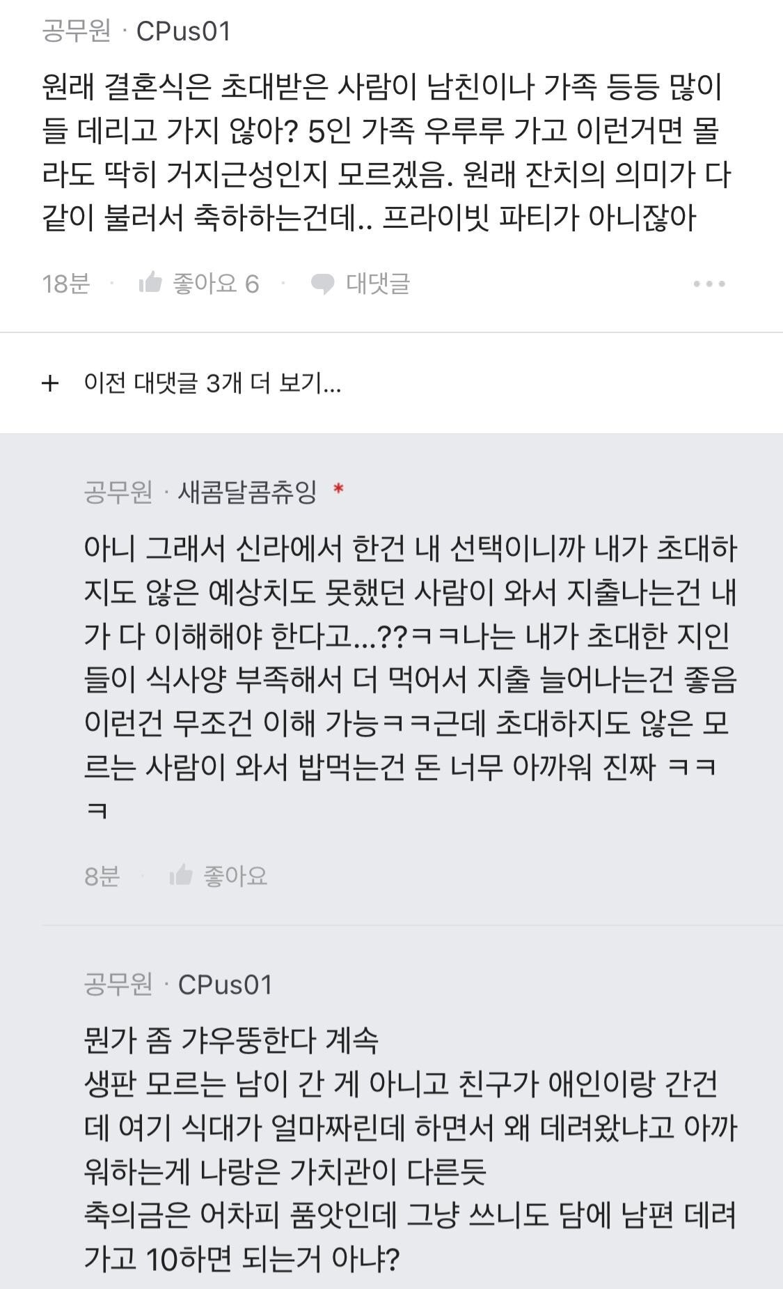 결혼식에 남친데리고 오는 사람 어때..??보통 초대받은 당사자만 오지 않어?ㅋㅋ식장도 신라라서 특급호텔인데 둘이 10냄,,ㅋㅋ