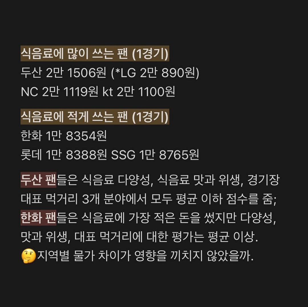 (원덬 사족 : 지역별 물가 차이도 있겠지만 같은 서울 연고팀인 LG나 키움이 순위권에 없는 걸 보면 걍 두산팬들이 잘 먹는게 맞음)